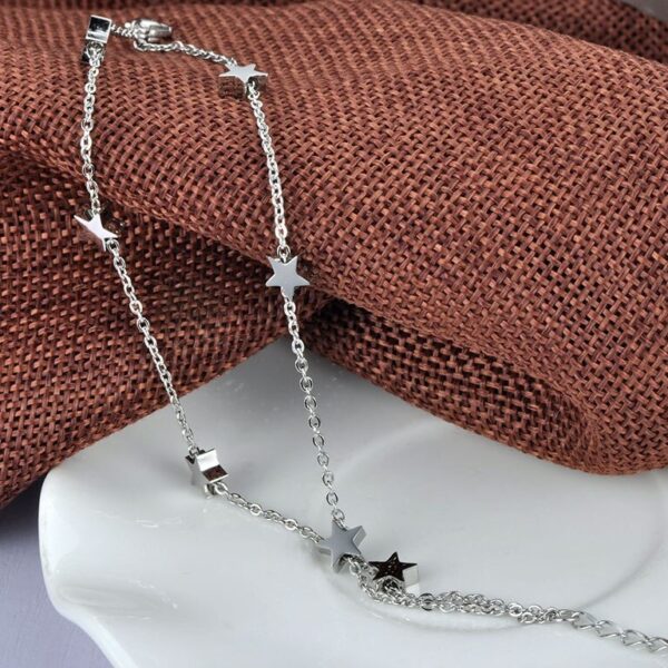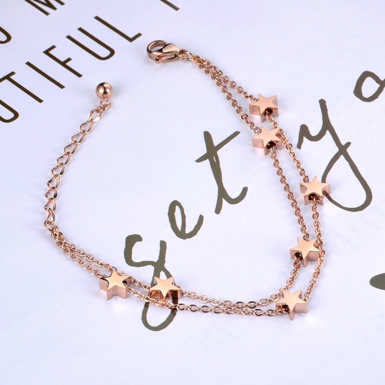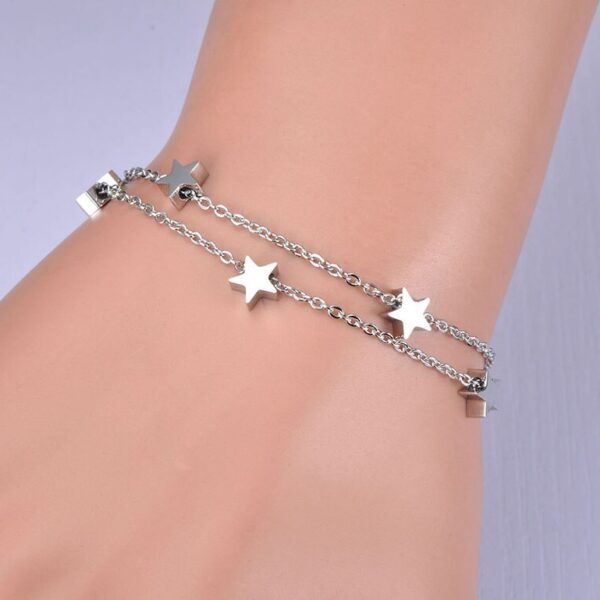 Elegáns nemesacél női karkötő. A díszítésről csillag medálok gondoskodnak. Minden karkötőt ajándék díszdobozban küldünk.