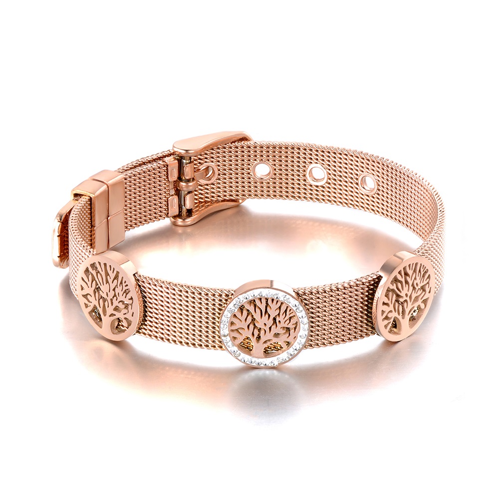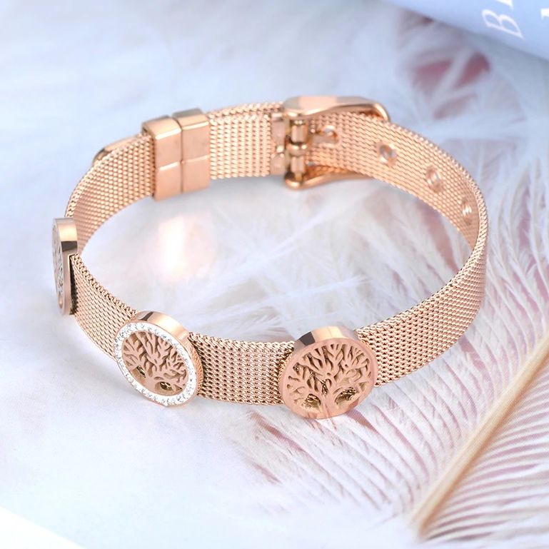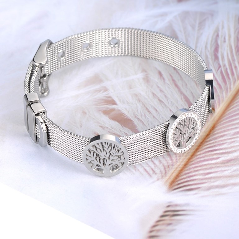 Elegáns nemesacél női karkötő. A díszítésről három darab stílusos életfa. Minden karkötőt ajándék díszdobozban küldünk.