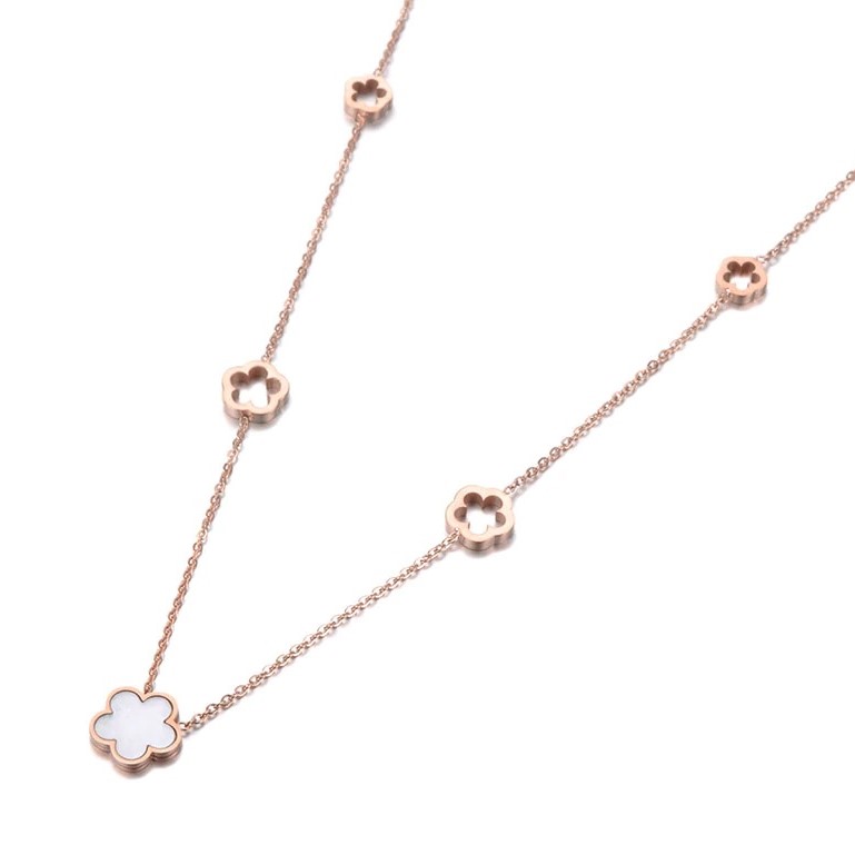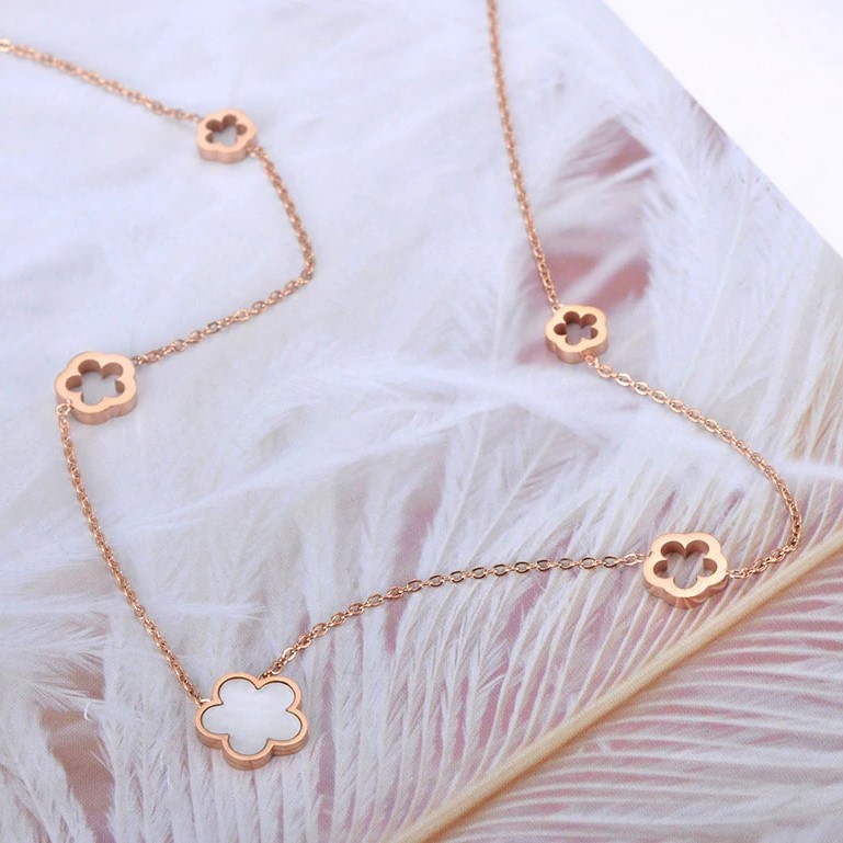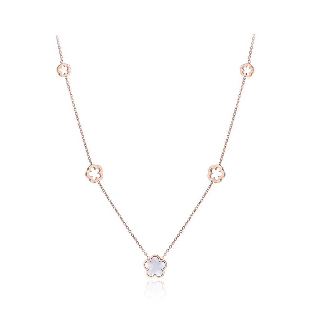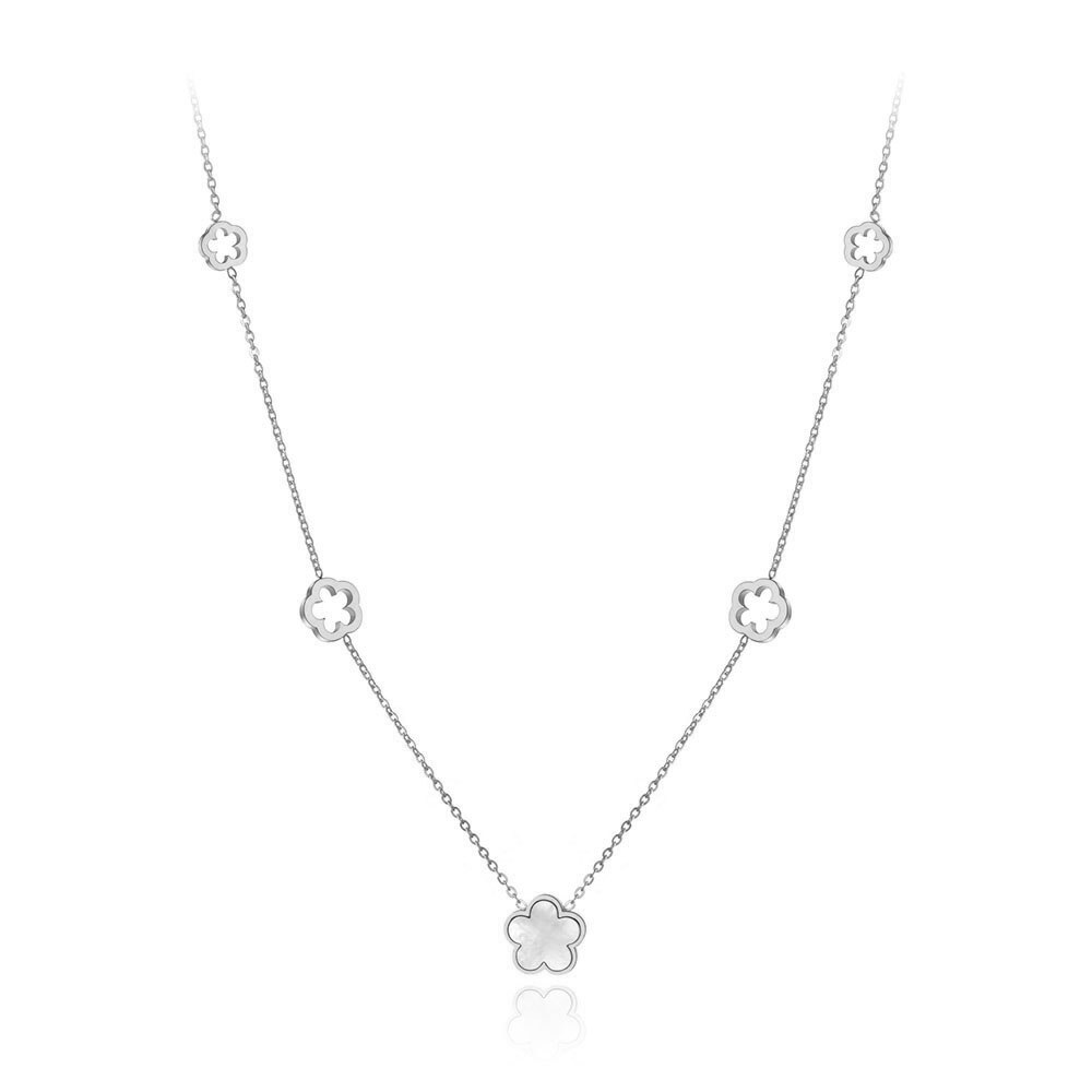 Elegáns, nemesacél női nyaklánc. Virág medálokkal, kagyló berakással.