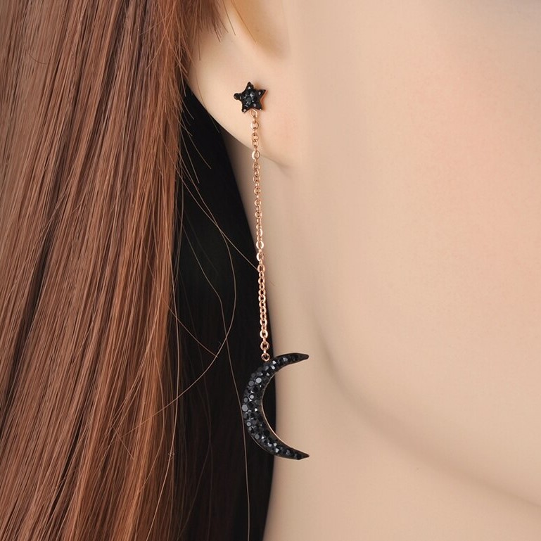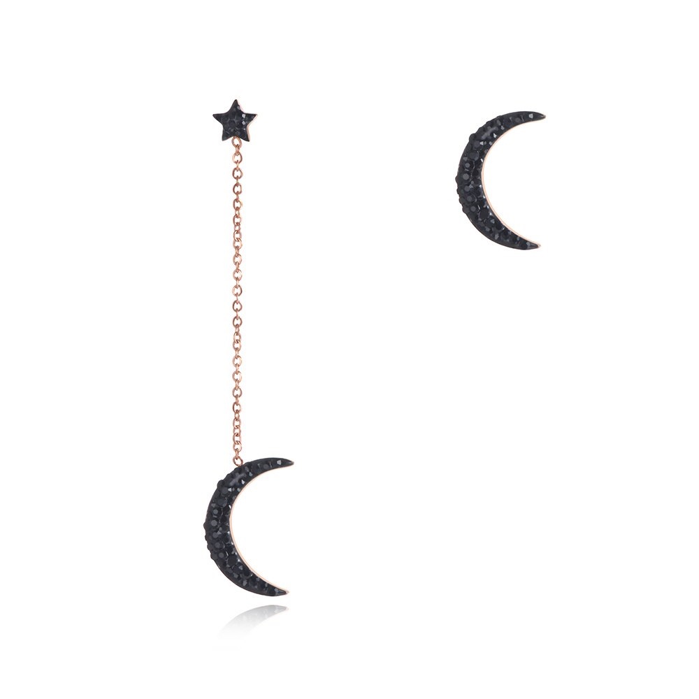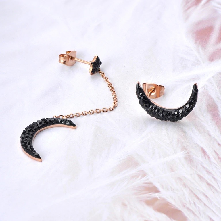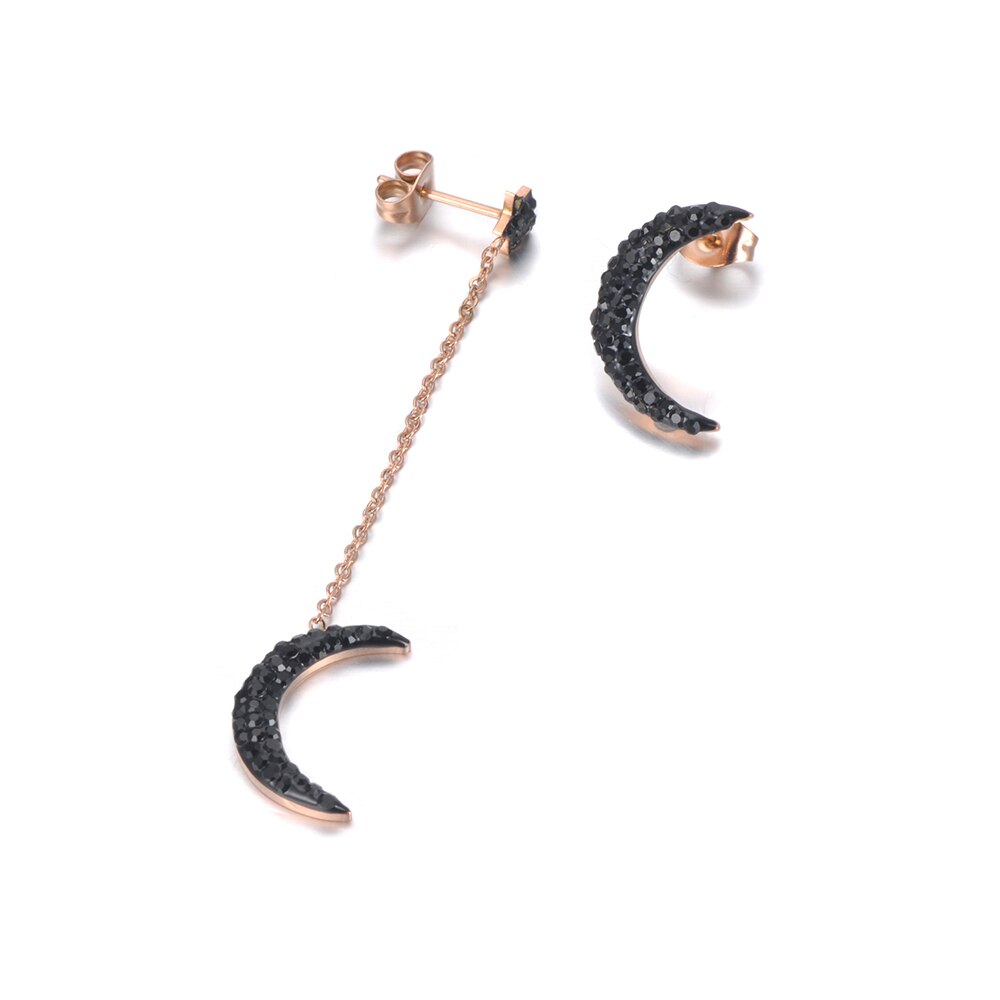 Elegáns rosegold nemesacél női fülbevaló fekete félhold medállal.